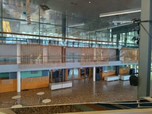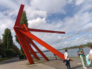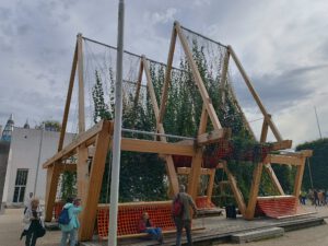 Da es so schön war, die Sonne schien und wir alle doch noch Lust auf „Mehr“ hatten, sind wir kurzentschlossen vom Haus der Geschichte zum Ausstellungsplatz zwischen Kunst- und Ausstellungshalle und dem Kunstmuseum Bonn gegangen. Ziel war „Vert“, eine nachhaltige Holzkonstruktion, an der sich verschiedensten Grünpflanzen emporranken, mit dem Ziel, zu einem grünen, kühlenden Segel heranzuwachsen.